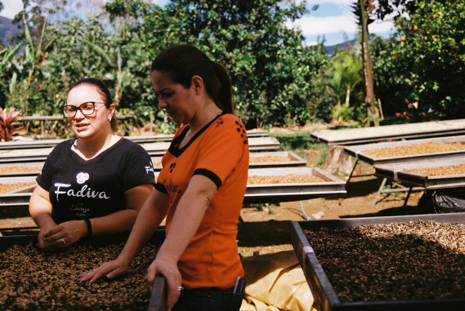 Marlen (left) and Angie (right) stand by their drying beds with coffee parchment in to tell us more about their family story in coffee.